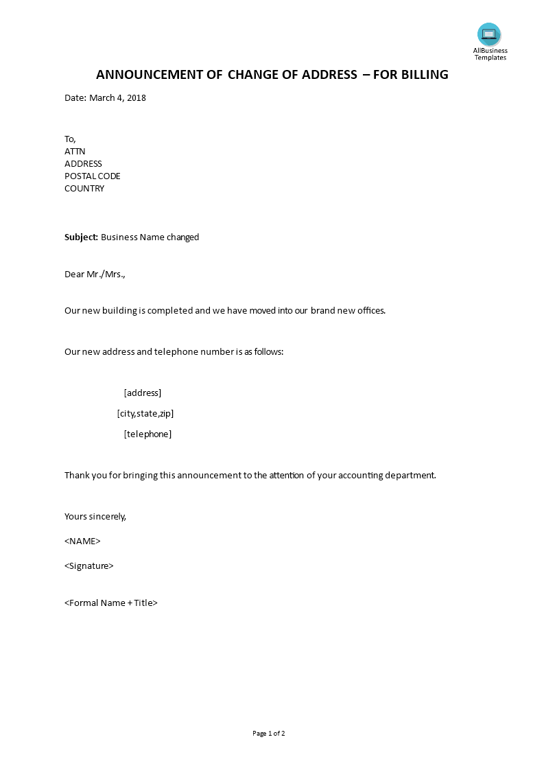 Change Of Address For Billing Announcement How To Write A Formal Change Of Address For Billing Announcemen Change Of Address Templates Professional Templates