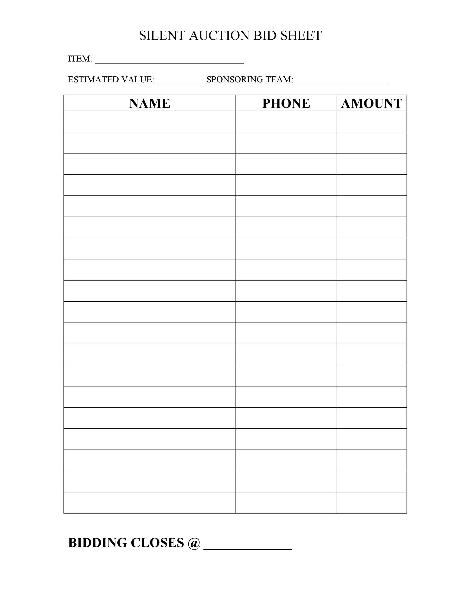 Free Printable Silent Auction Bid Sheet Templates PDF Examples Ideas
