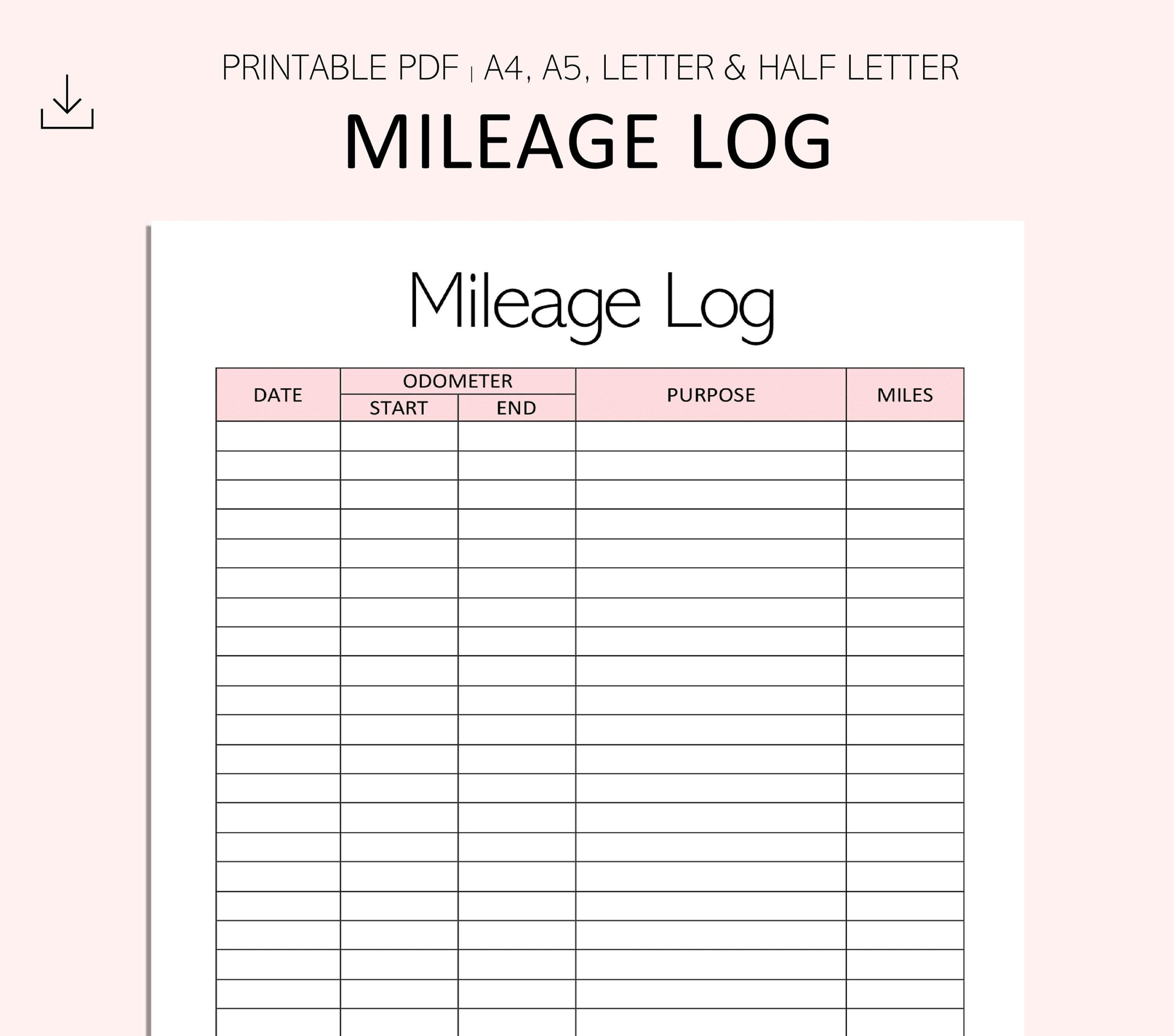 Mileage Log Printable Vehicle Miles Travelled Tracker Mileage Tracker Car Mileage Printable PDF A4 A5 Letter Half Letter Etsy