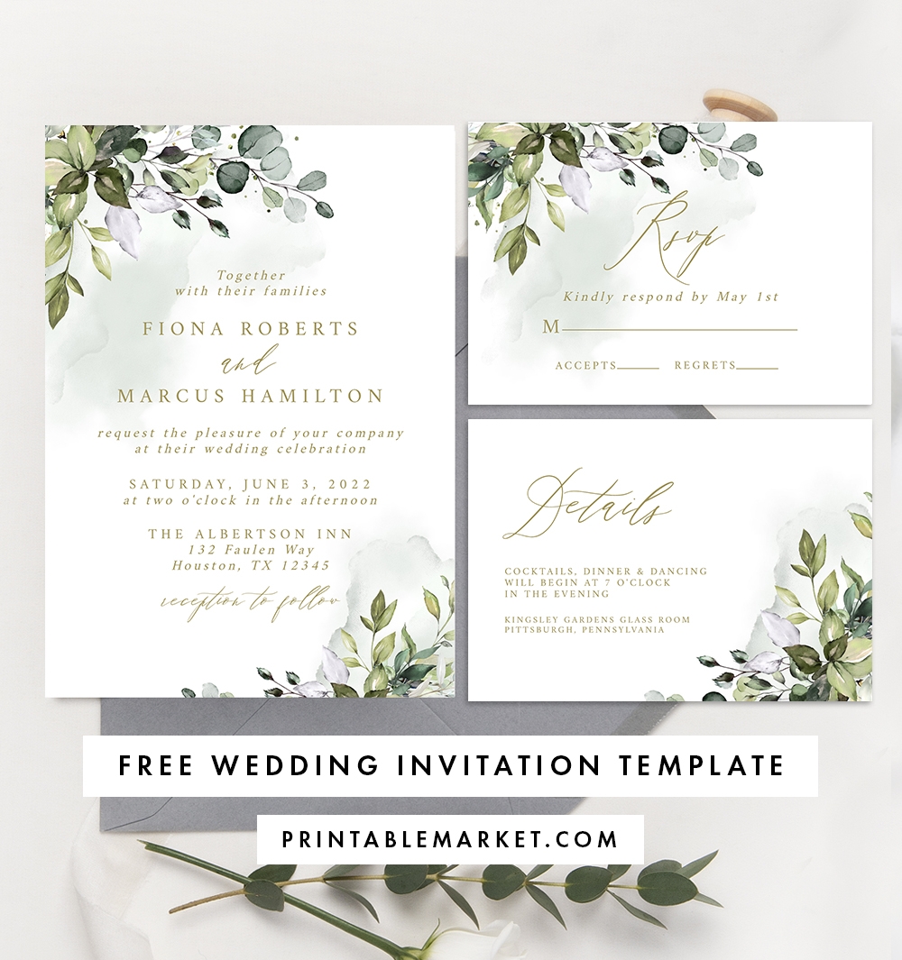Free Wedding Invitation Template Eucalyptus Green Leaves Instant Download Printables Instant Download Printables Free Printable Wedding Invitation Templates Free Printable Wedding Invitations Free Wedding Printables