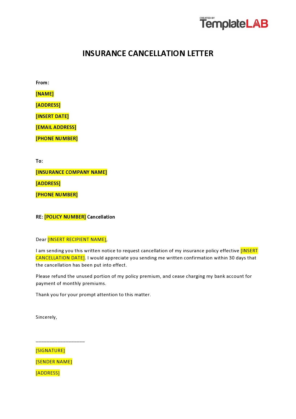Free Printable Insurance Cancellation Letter Templates PDF Word