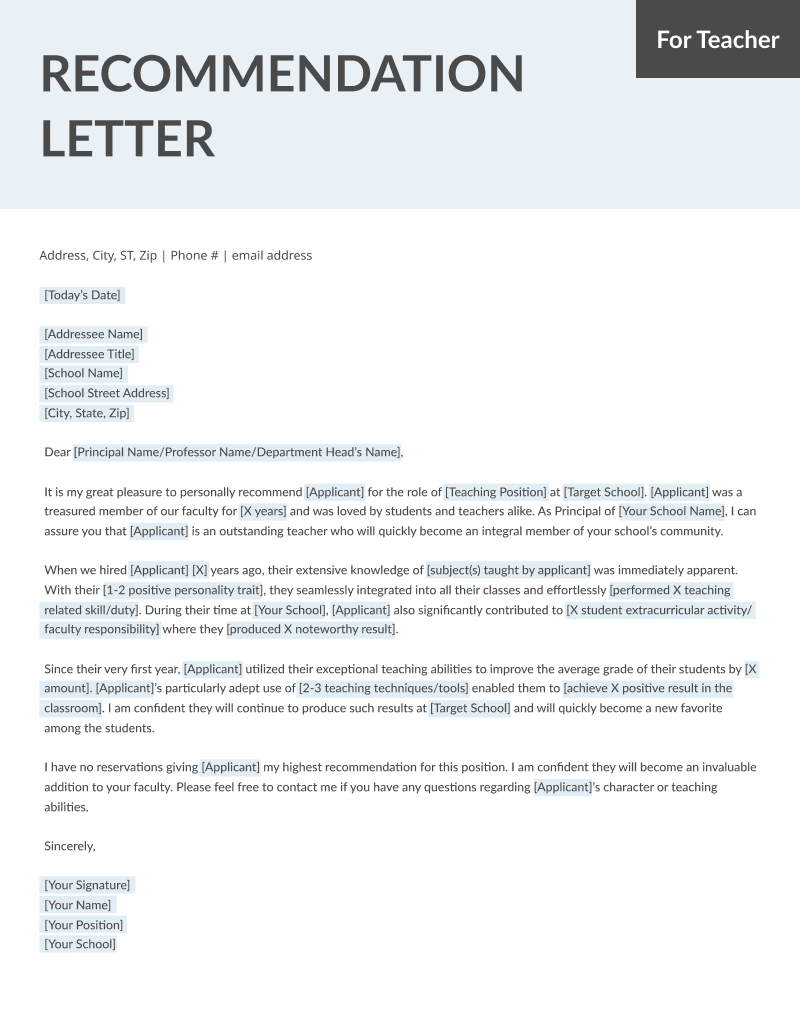 Free Letter Of Recommendation For Teacher Template CocoSign