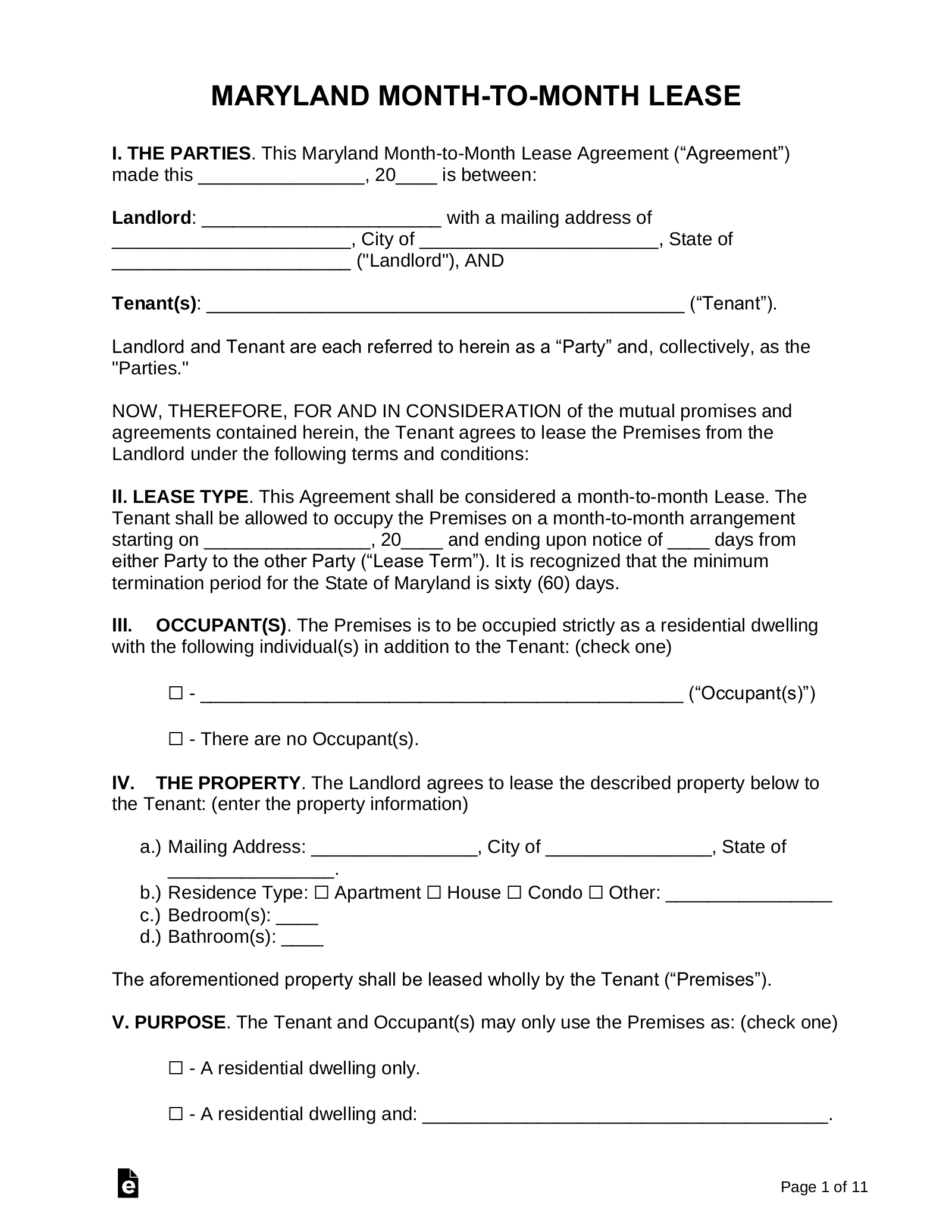 Free Maryland Month To Month Rental Agreement PDF Word EForms