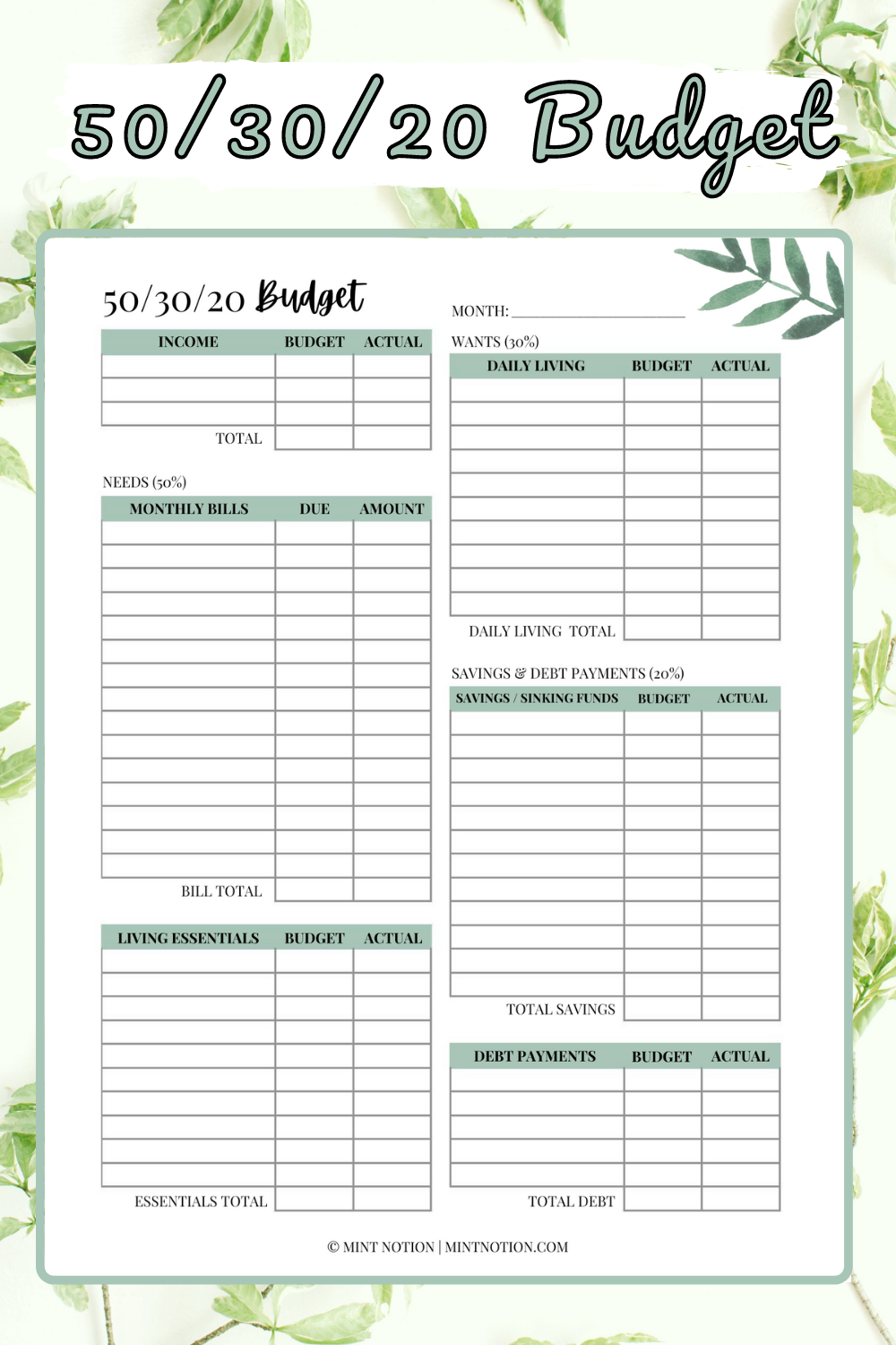 Printable 50/30/20 Budget Template