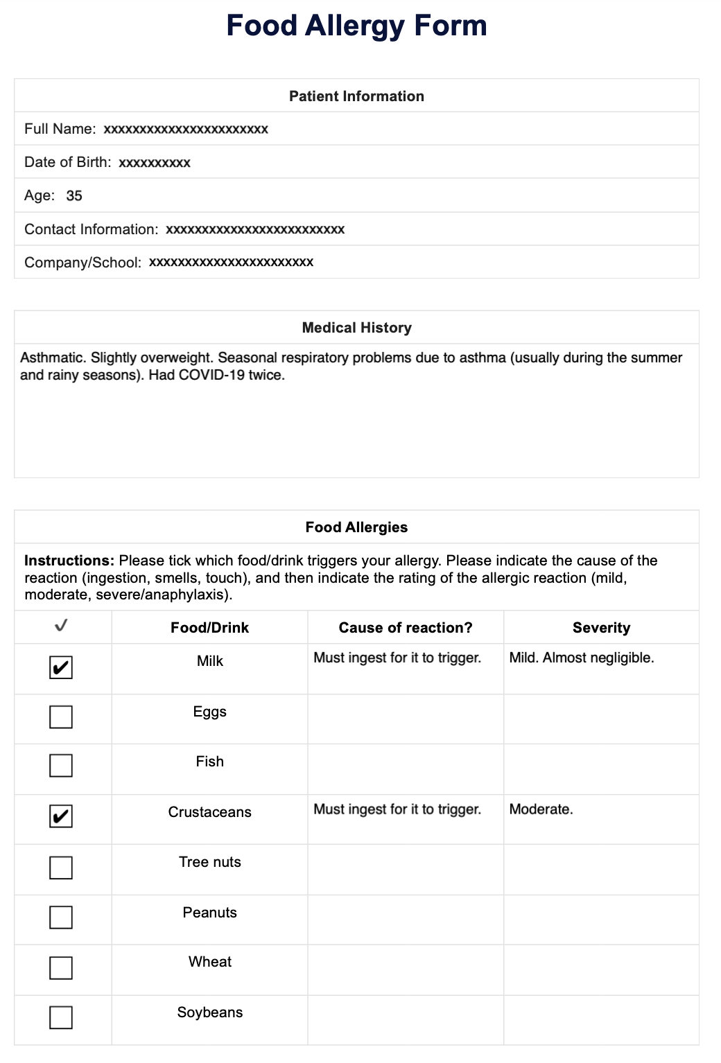 Food Allergy Form Example Free PDF Download