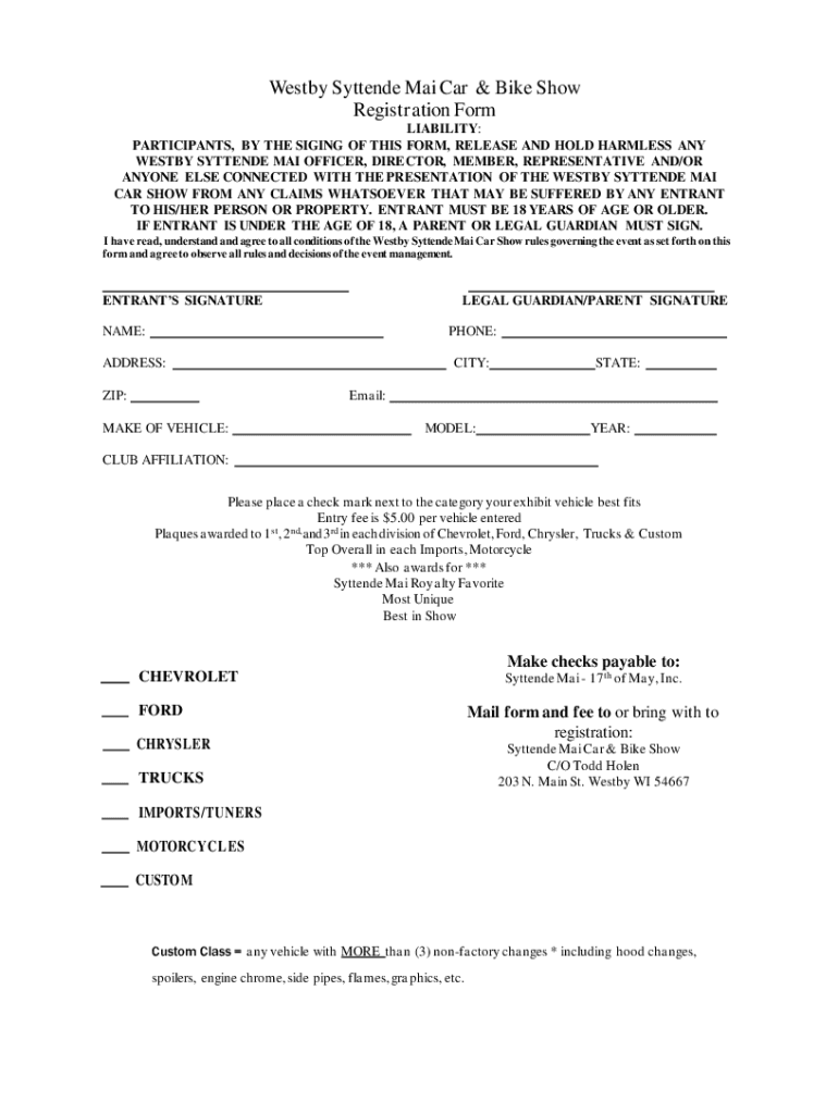 2022 2024 WI Westby Syttende Mai Car Bike Show Registration Form Fill Online Printable Fillable Blank PdfFiller