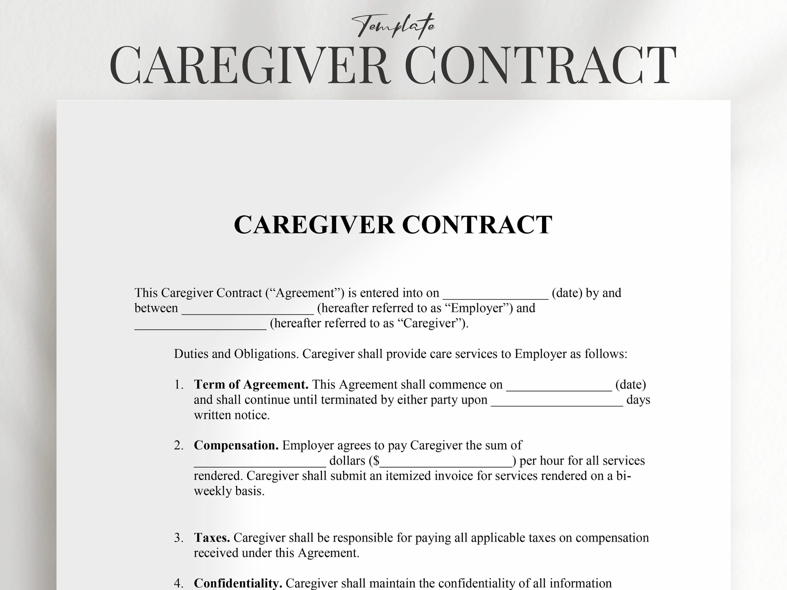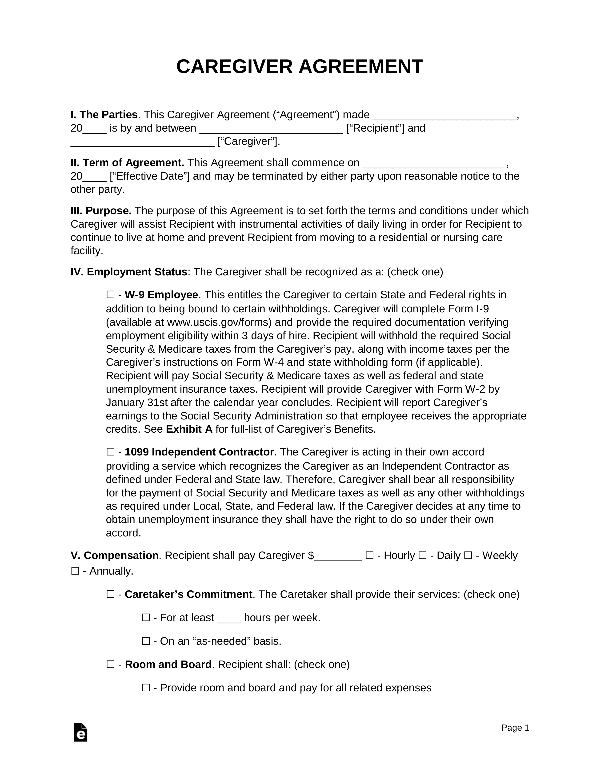 Printable Caregiver Contract Template