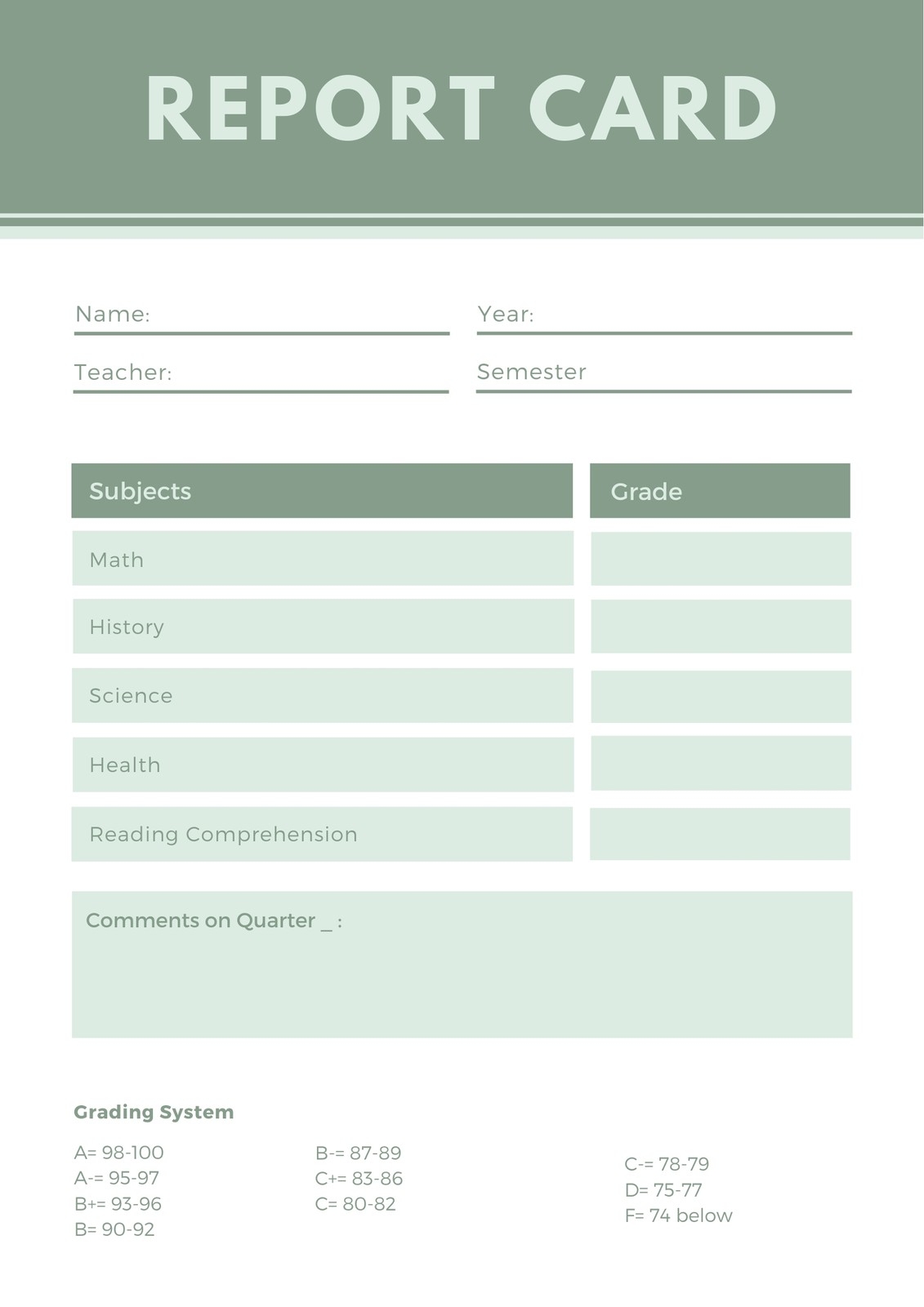 Printable Downloadable Report Card Template