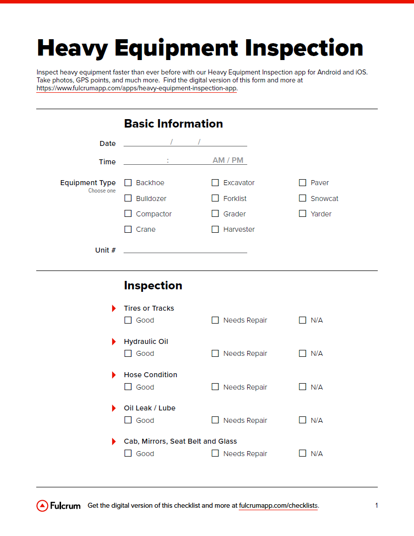 Construction Equipment Inspection Checklist Fulcrum
