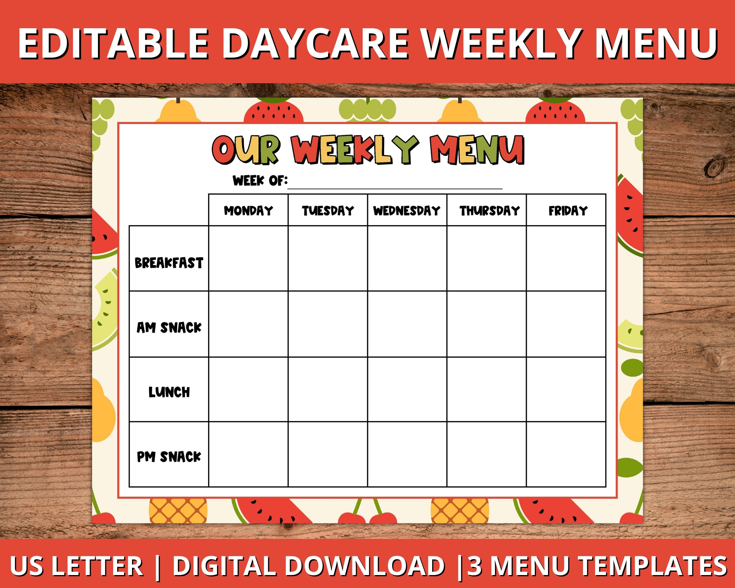 Editable Daycare Weekly Menu Editable Daycare Menu Fillable Daycare Weekly Meal Planner Printable Etsy