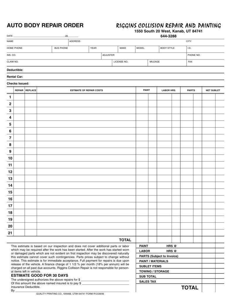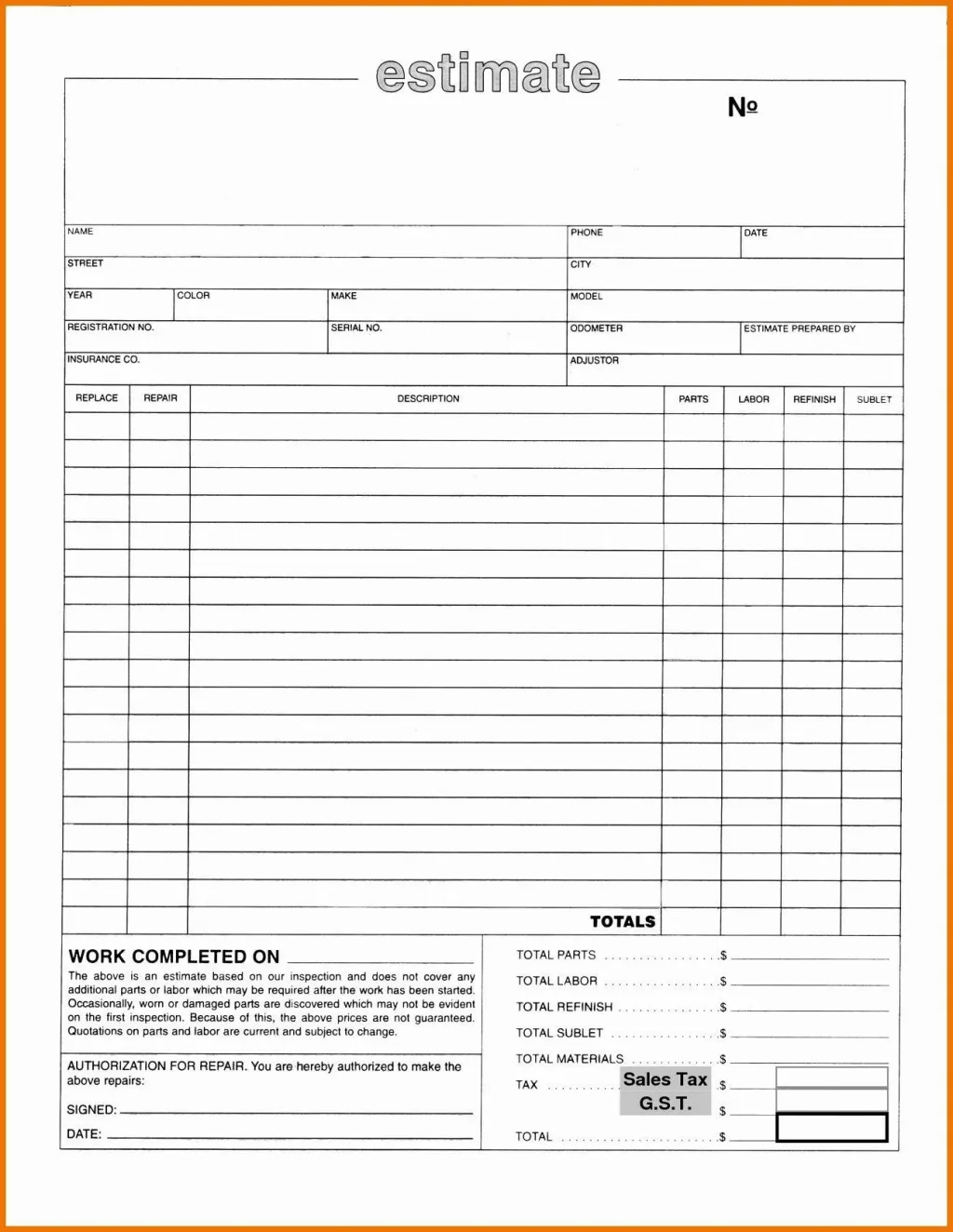 Body Shop Estimate Form Template Auto Body Repair Estimate Template Auto Body