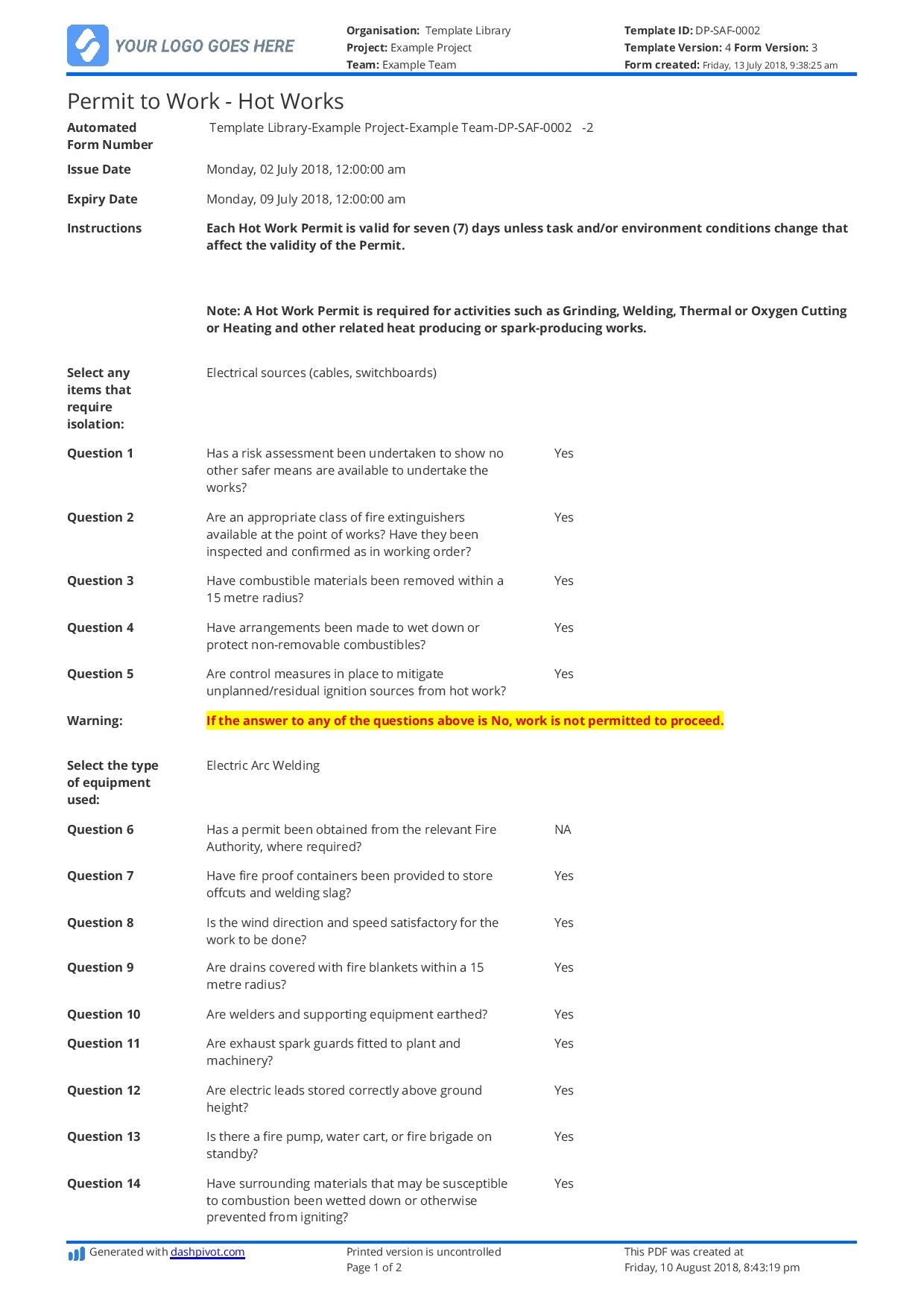 Free Hot Works Permit Template Better Than Word And PDF
