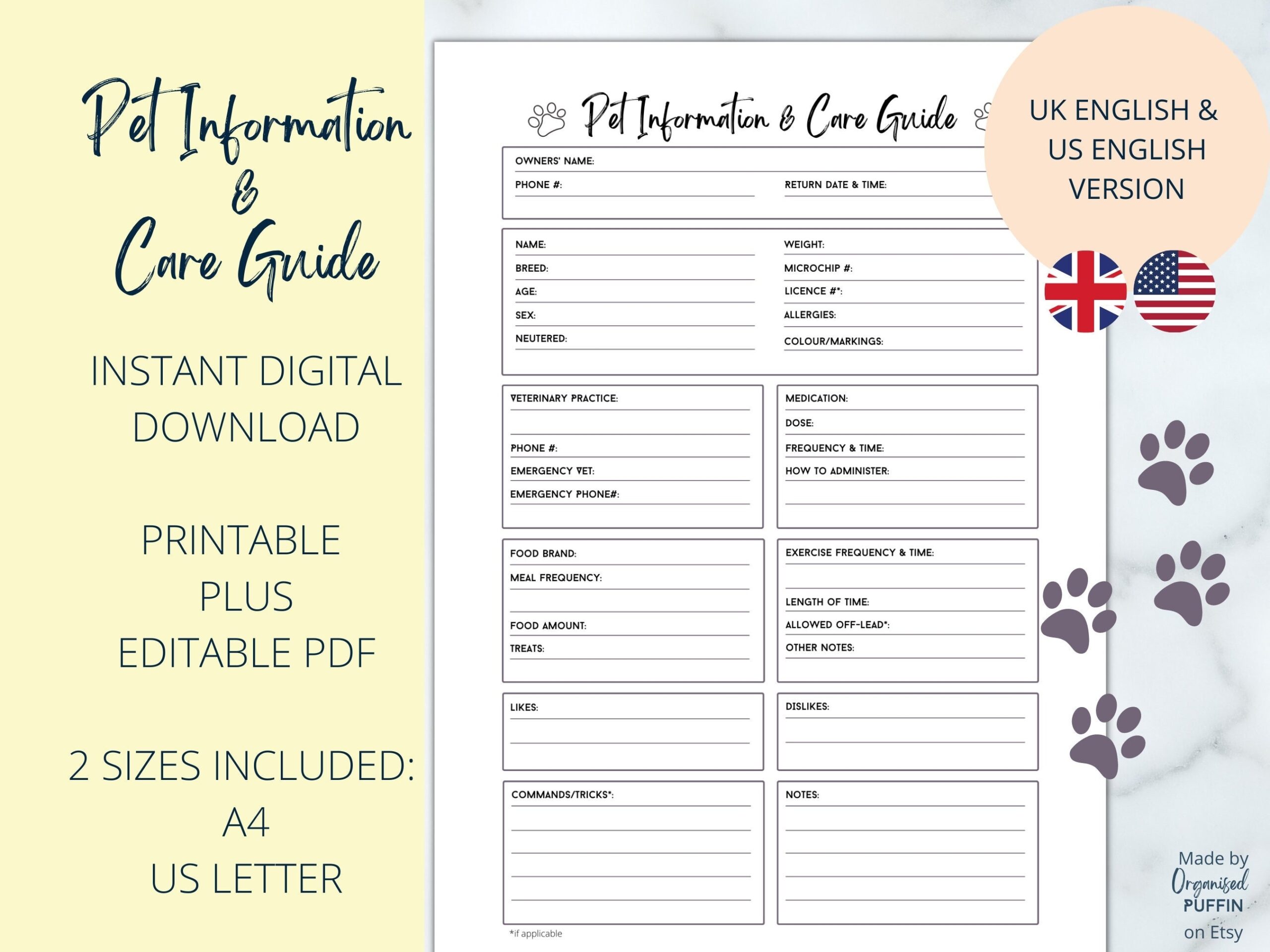 Pet Sitter Notes Printable PDF Owner Info Template Dog Cat Or Other Animal Daily Care Form Digital Download US Letter A4 Etsy