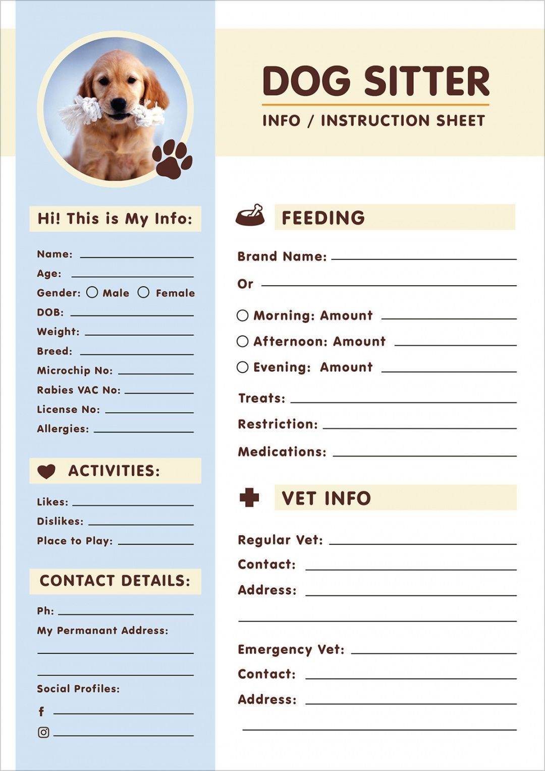 Pet Sitter Notes Printable PDF Owner Info Template Dog Cat Or Other Animal Daily Care Form Digital Download US Letter A4 Etsy