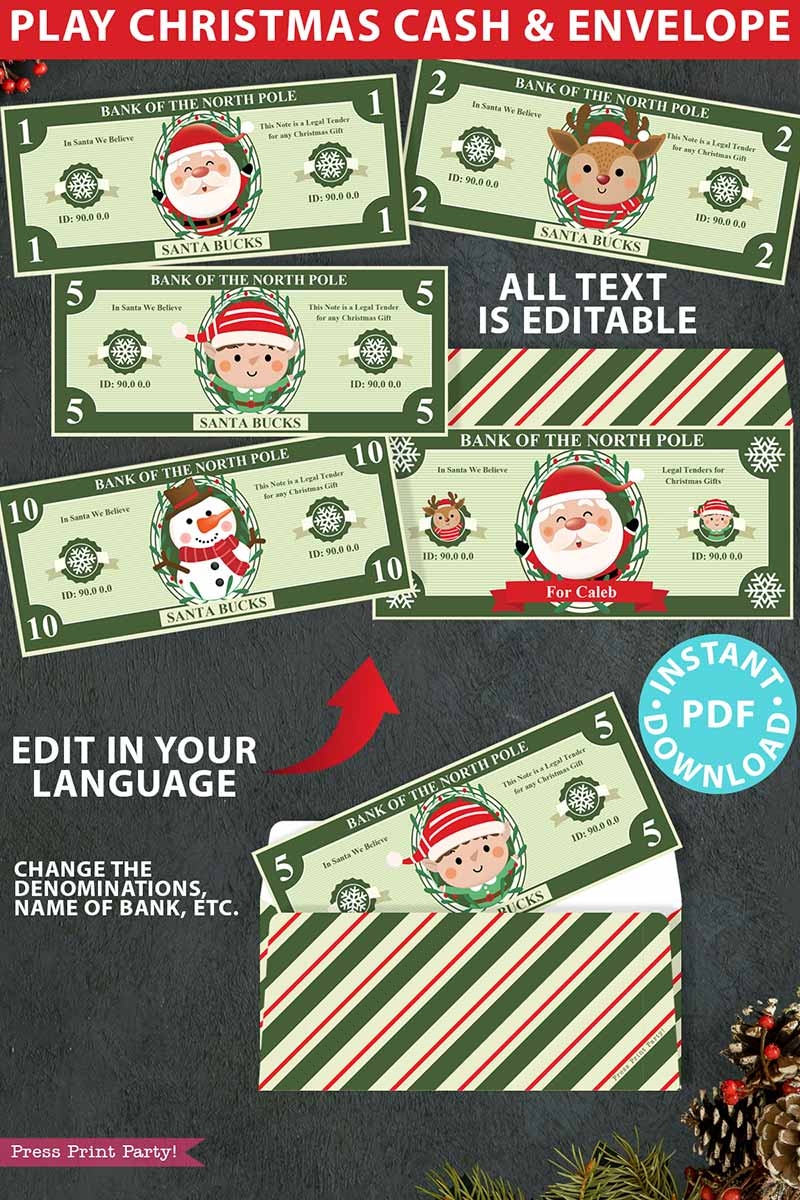 Holiday Santa Bucks Printable North Pole Money Instant Download Santa Dollars Pretend Money Last Minute Gift Etsy