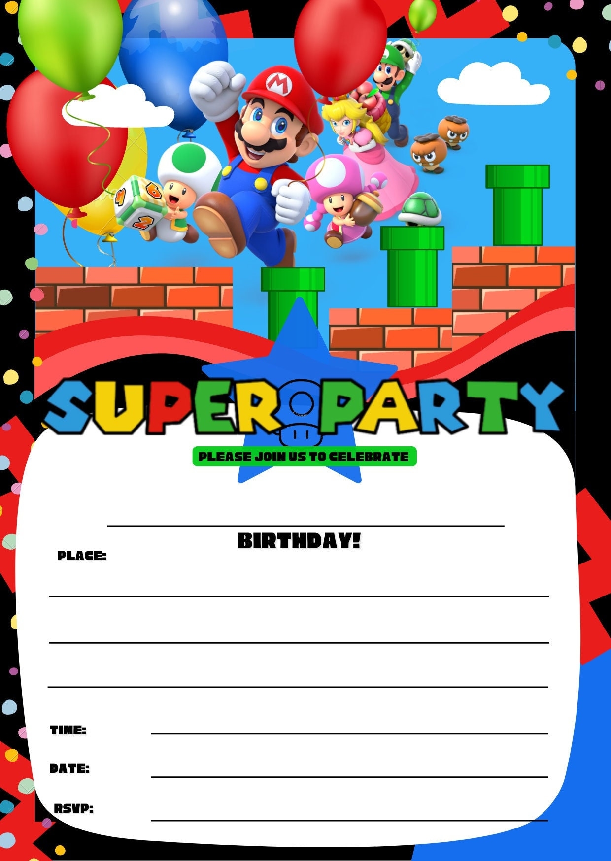 Super Mario Birthday Invitation Digital Card Printable Invite Mario Invitation Super Mario Bros Digital Invitation PRINTABLE Template Etsy