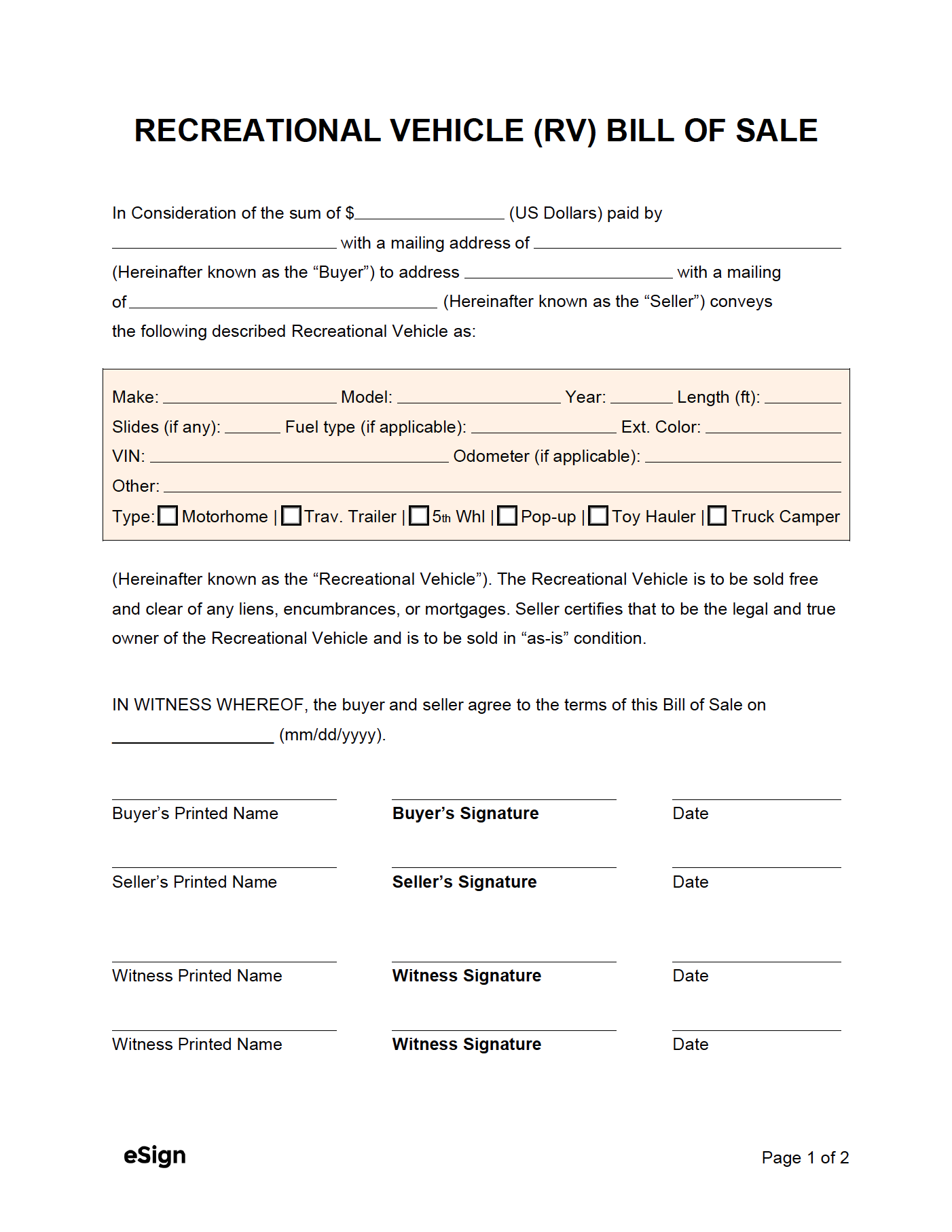 Free Recreational Vehicle RV Bill Of Sale Template CocoSign