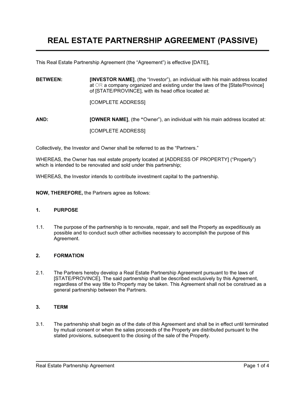 Passive Real Estate Partnership Agreement Template Business in a Box